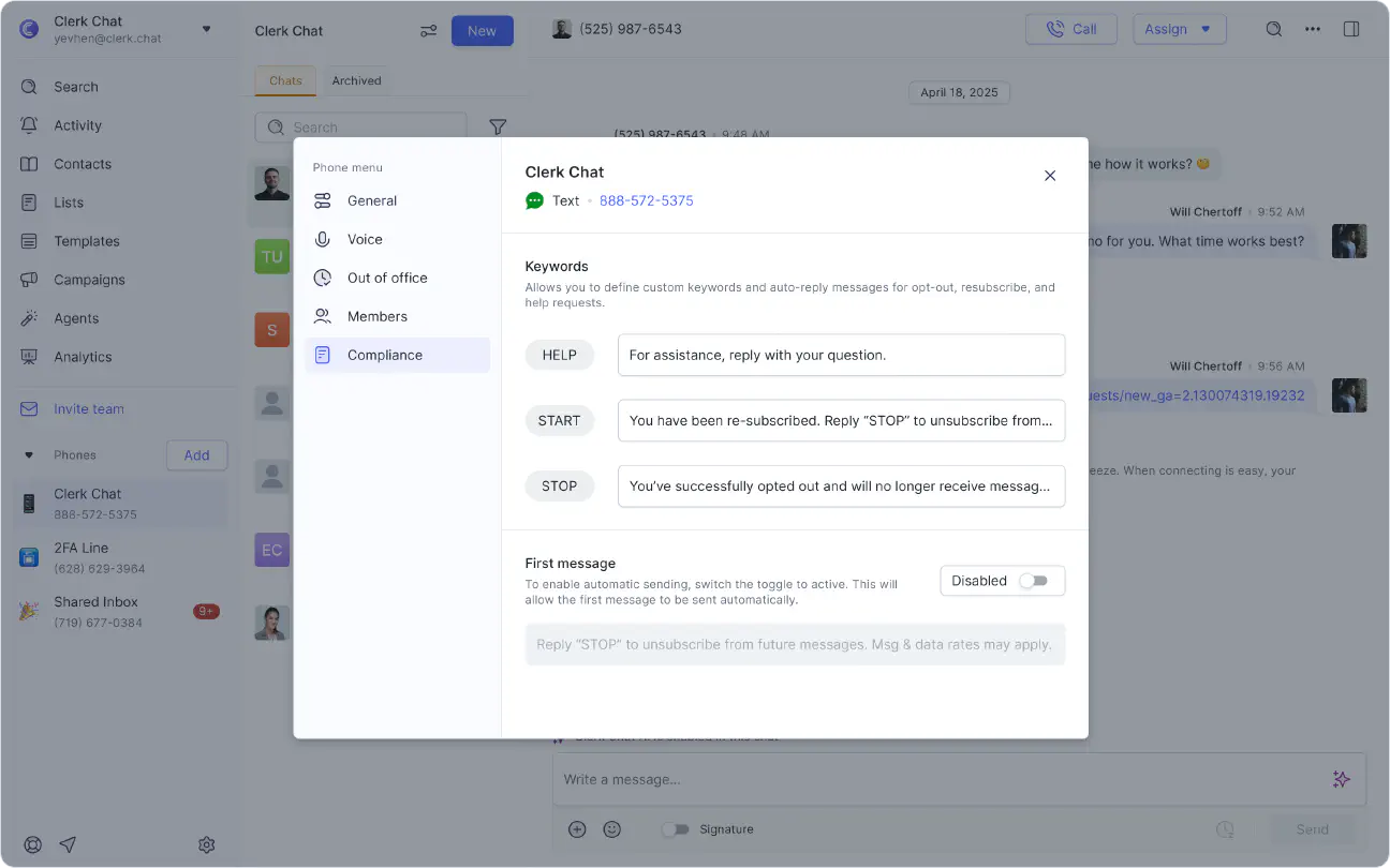 You can now open any phone number in Clerk Chat and set custom compliance messages that only apply to that number rather than rely on a universal template or message.