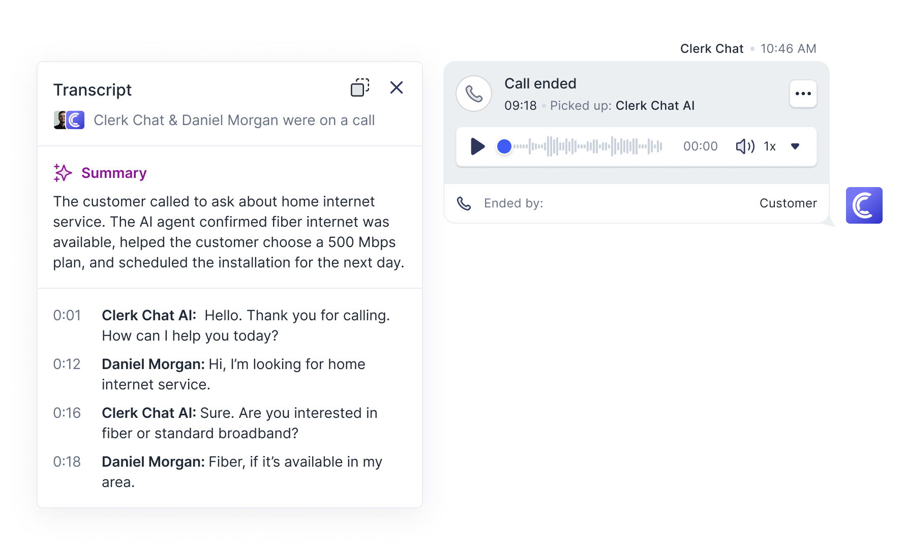 When calls go unanswered, Clerk Chat’s voicemail detection identifies answering machines with 97%+ accuracy. The AI agent leaves personalized voicemails tailored to each contact - not generic scripts - increasing callback rates and brand perception.