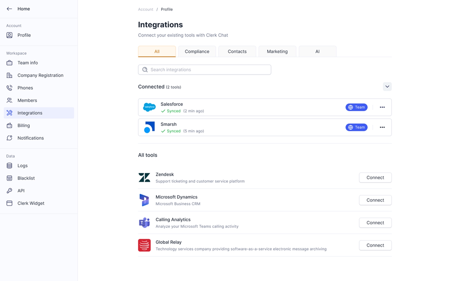 Clerk Chat automatically syncs to Microsoft Purview, Global Relay, and Smarsh, ensuring consistent, compliant archiving.