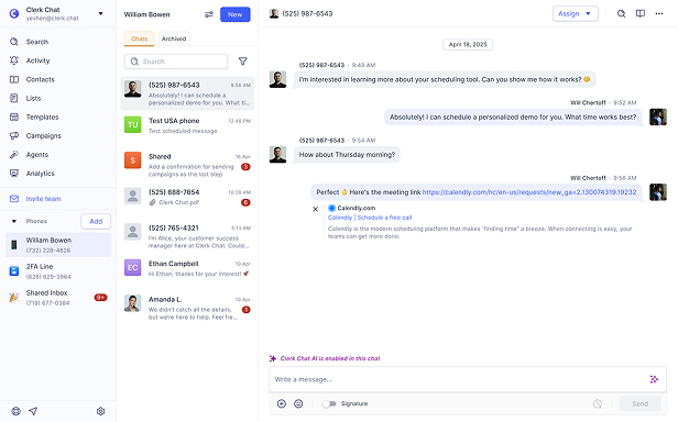 Clerks answer complex questions, handle bookings, and never forget to follow up — all through voice and RCS messaging.